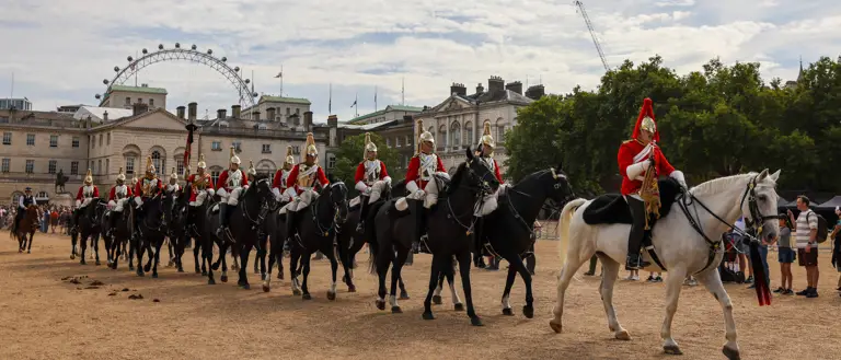 On weekdays, The King’s Life Guard leaves Hyde Park Barracks at 10:28 am and rides to Horse Guards Parade passing through Hyde Park Corner and along Constitution Hill and The Mall. The ceremony of Changing The King’s Life Guard then takes place on Horse Guards Parade at 11:00 am.