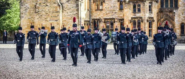The band and the Regiment’s history is manifested in their green uniforms. The unique coloured jackets and black buttons stem back to the 17th Century when Riflemen were the first British soldiers to wear camouflage instead of red tunics. Silver bugles allowed orders to be passed over long distances because Riflemen operated in dispersed teams with individuals selected for their marksmanship, fitness and initiative. The band’s accelerated pace and 'double' march, still used across the Regiment today, reflect a tradition of quick movement and thinking.