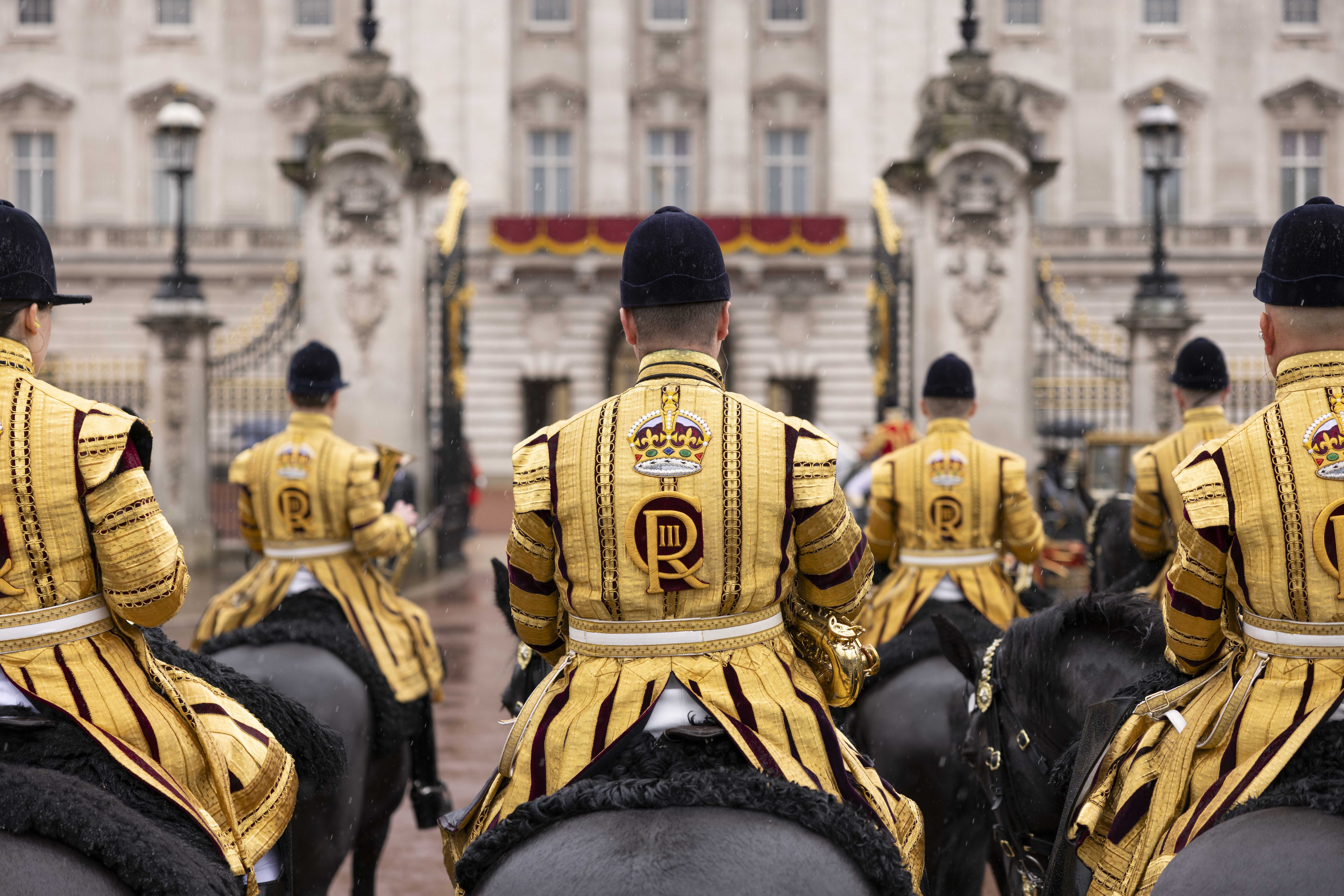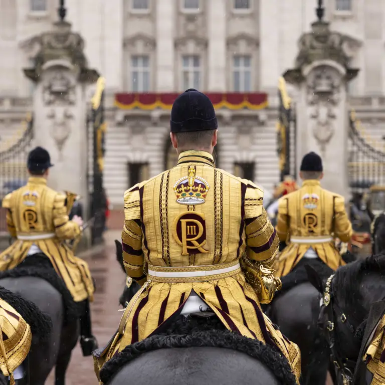 Both Household Cavalry uniforms are worn on parade however, when Senior Royalty are present, the band wear the distinctive State Dress which consists of the world famous Gold Coat and blue jockey caps. State Dress is the oldest continually worn uniform in the British Army; purchased by The Lord Mayor of London for the restoration of King Charles II 1660.