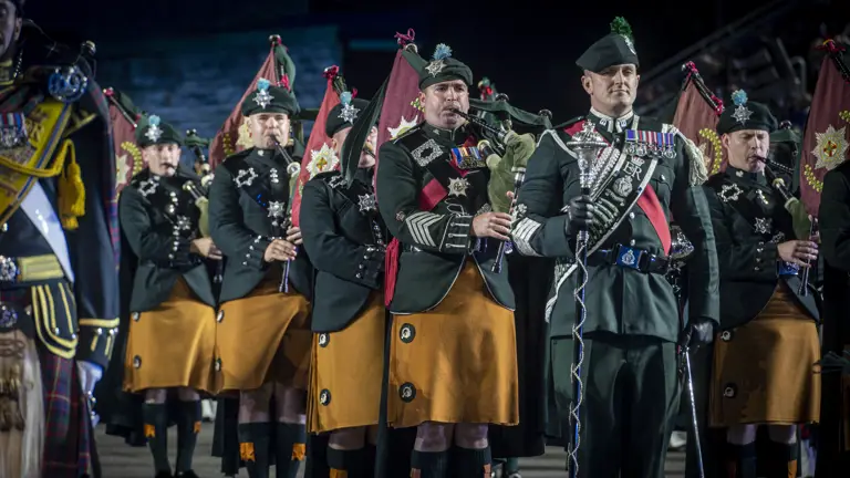 The Massed Pipes and Drums is made up of more than 230 pipers and drummers, including the Pipes and Drums of 1st Battalion Irish Guards, 1st Battalion Scots Guards, The Royal Gurkha Rifles and the Combined Pipes and Drums of the Royal Tank Regiment and the Scottish and North Irish Yeomanry. The military bands will be supported by fellow pipers and drummers and military musicians from around the world.