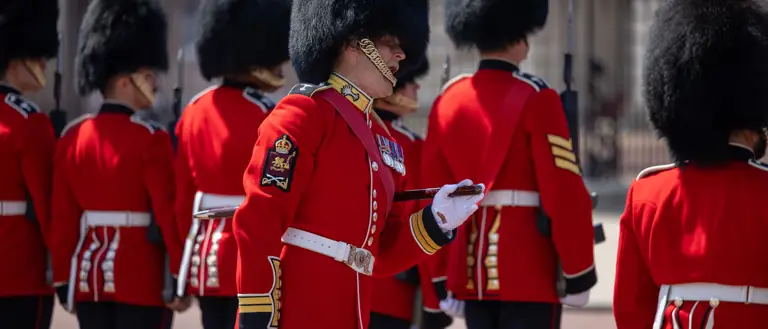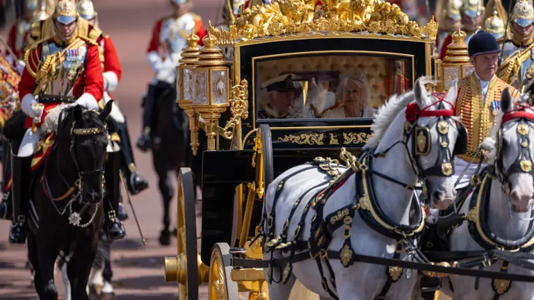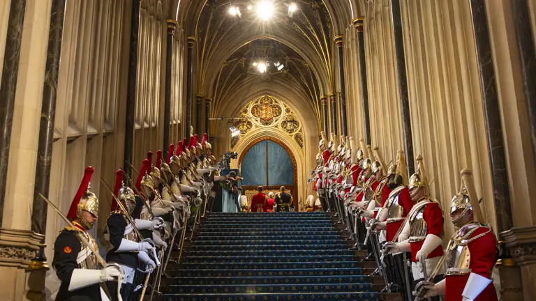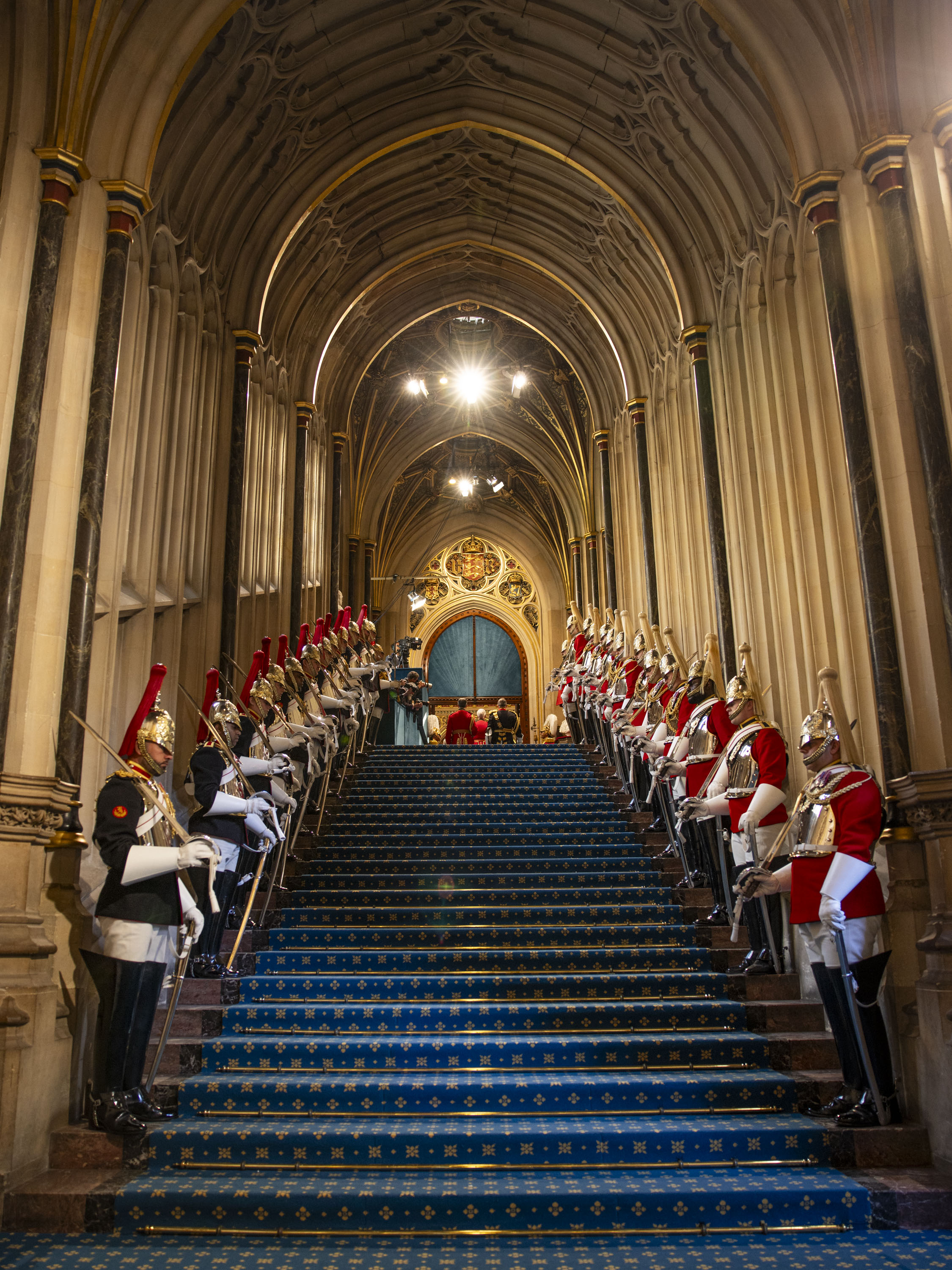 Grenadier Guards, Irish Guards and Coldstream Guards, joined RAF and Royal Navy personnel, to line the route of the royal procession from Buckingham Palace to the House of Lords, while The Crown Regalia and The King were escorted on their way by troopers from the Household Cavalry Mounted Regiment.