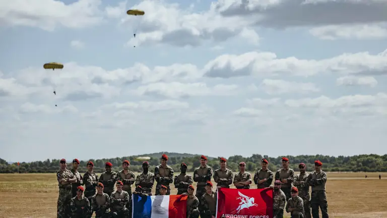 French paratroopers jumped in the skies of Oxfordshire under British parachutes on Tuesday (8 Jul) as His Majesty The King and Emmanuel Macron drove in a ceremonial carriage procession through Windsor, along streets lined by personnel from the Royal Navy, the British Army and the Royal Air Force (RAF).