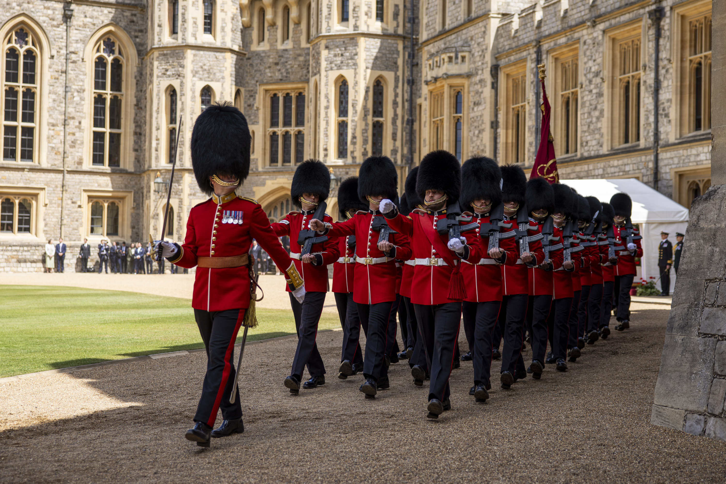 The large Guard of Honour soldiers in their scarlet tunics contrasted vividly against the green grass at the heart of the Medieval Castle, and the space reverberated with the sounds of the Massed Band of the Grenadier Guards and Scots Guards.