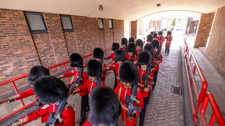 The Grenadier Guards could be distinguished by the white plume in their bearskin caps, a ‘grenade fired proper’ embroidered on their collars and singular buttons on their scarlet tunics; while the Scots Guards’ bearskins have no plume, the soldiers have thistles embroidered on their collars, and wear buttons in rows of three.