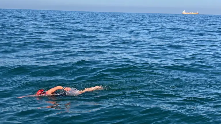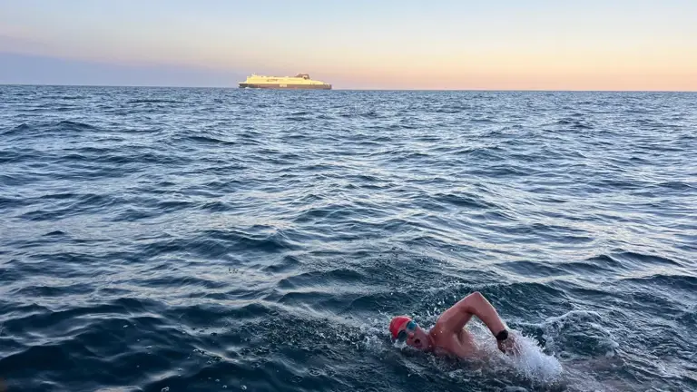 “The water was around 12 degrees which may not sound that cold. But when you are only wearing Speedos, after a few minutes you can only get warm by swimming faster. Finding a rhythm that balanced staying warm with not fatiguing, while fighting the tides and the current, was critical.