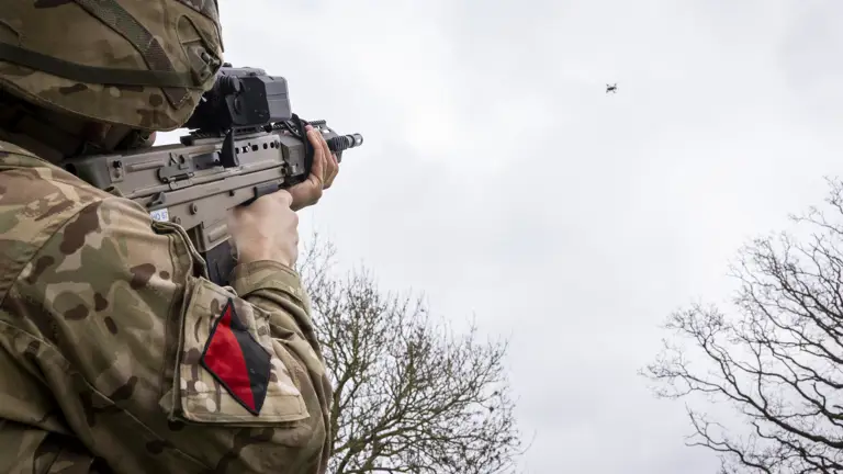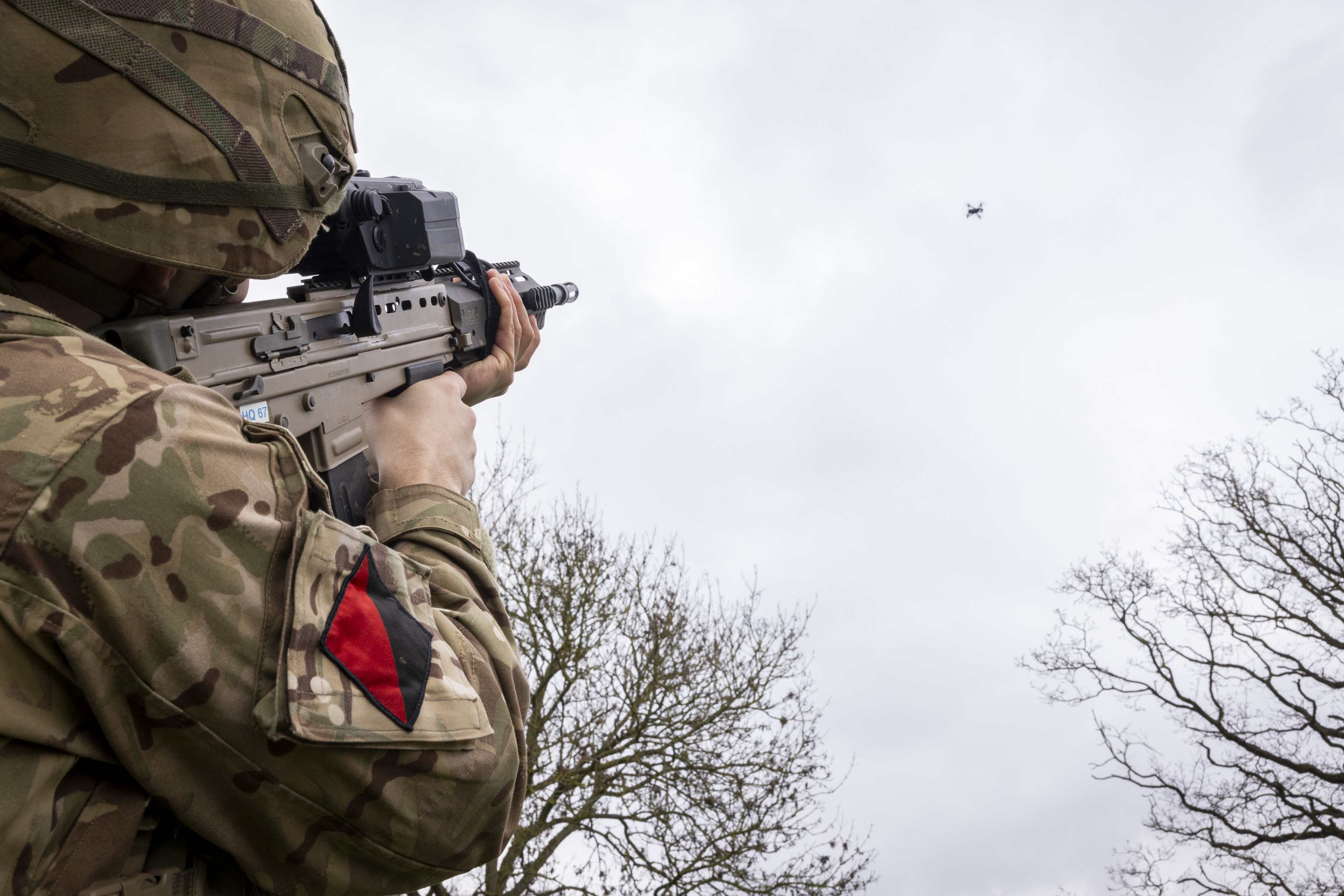 As the Army’s highest readiness formation, 16 Air Asslt Bde is at the forefront of UAS and counter-UAS operations. It is the first to be issued with the SMASH sight, which mounts on the standard issue SA80 A3 assault rifle and uses image processing software to help soldiers shoot down UAS.