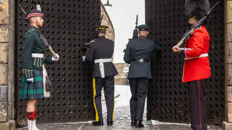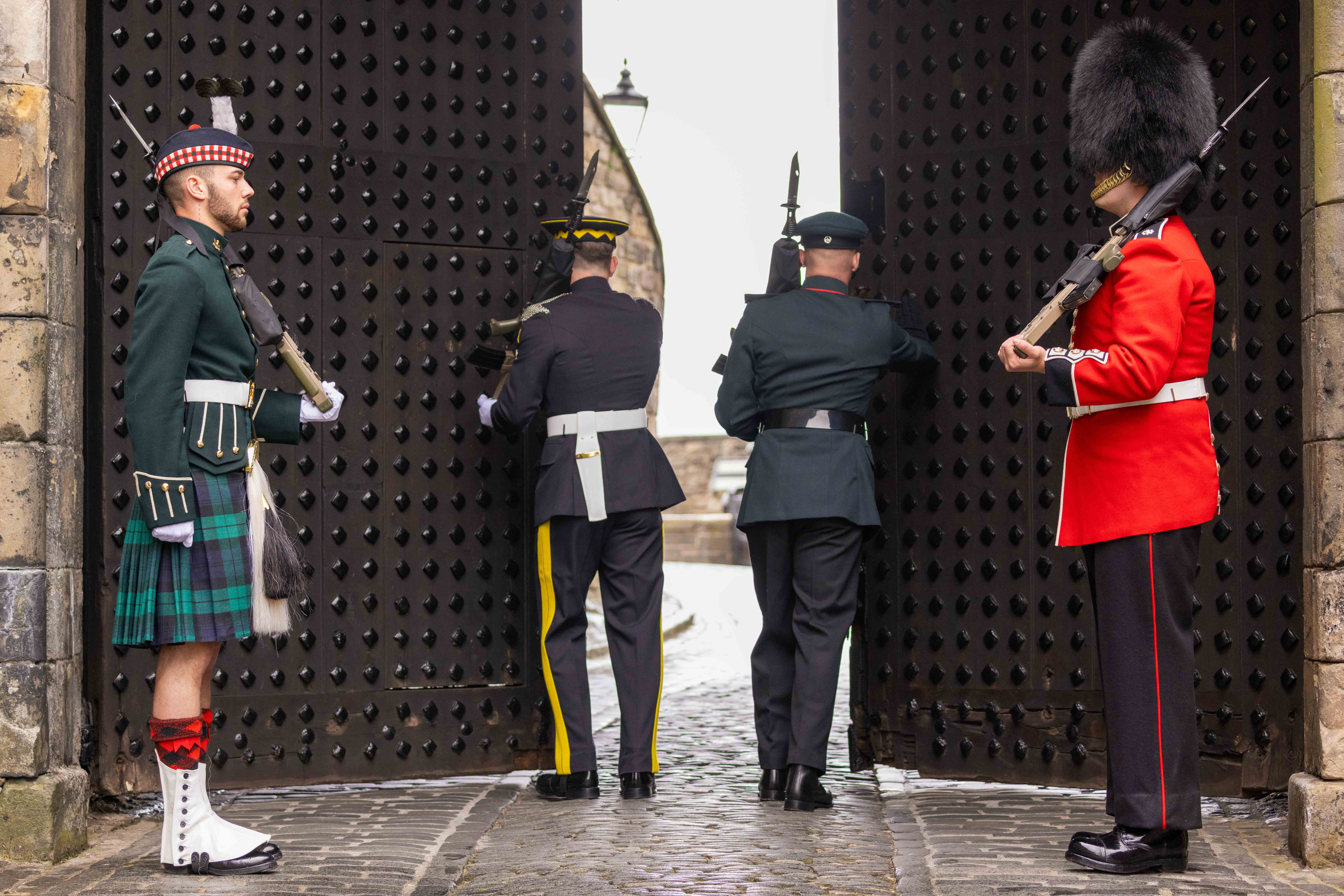 Sentries were provided by the Scots Guards, Royal Regiment of Scotland, Royal Scots Dragoon Guards, and The Rifles. Members of Balaklava Company, 5th Battalion The Royal Regiment of Scotland (BKA Coy, 5 SCOTS) formed the Guard of Honour as Their Majesties made their way to Crown Square.