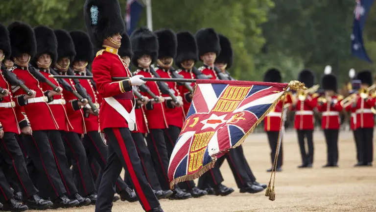 The honour to Troop their Colour rotates through the five regiments of Foot Guards, and this year (2024) it lies with Number 9 Company Irish Guards. The Irish Guards were raised by Queen Victoria in 1900 and have provided almost 125 years of loyal service to the Monarchy and the nation. This is however the first time that one of the Irish Guards Public Duties Companies will Troop Their Colour on a Sovereign’s Birthday Parade, and the first time that the Irish Guards have trooped in front of The King. This is because Number 9 and Number 12 Irish Guards Public Duties Companies were formed in September 2022 in the final days of Her Late Majesty Queen Elizabeth II’s Reign.