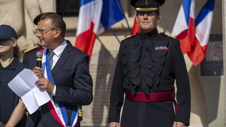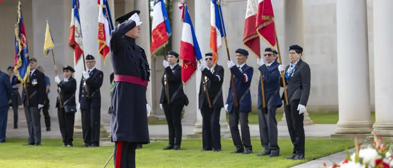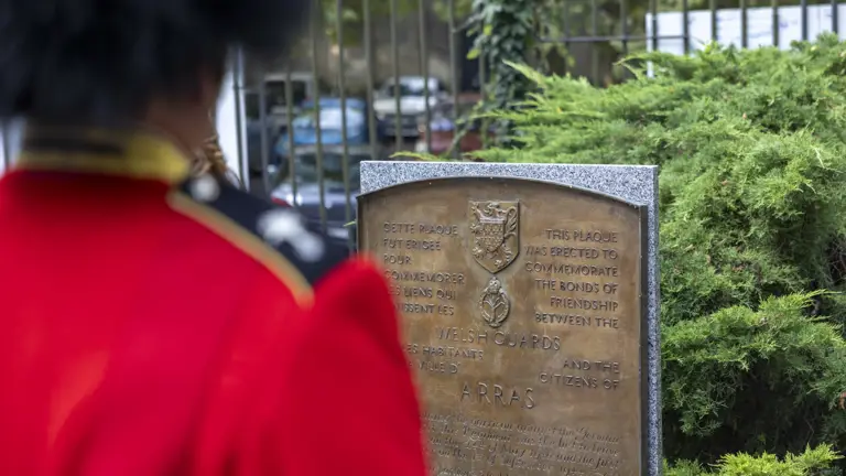 It was followed by a short journey to the British Memorial in Arras to remember the fallen as part of a larger ceremony where the Welsh Guards, the people of Arras and those representing other French forces from the Second World War gathered to pay tribute to those who liberated Arras eighty years ago. Lieutenant Colonel Guy Bartle-Jones, the Regimental Adjutant, Welsh Guards, laid a wreath on behalf of the Welsh Guards, as did Frédéric Leturque, Mayor of Arras, for the French.
