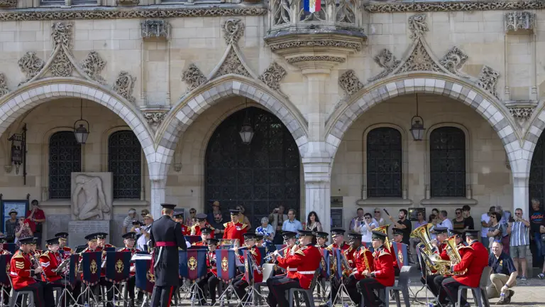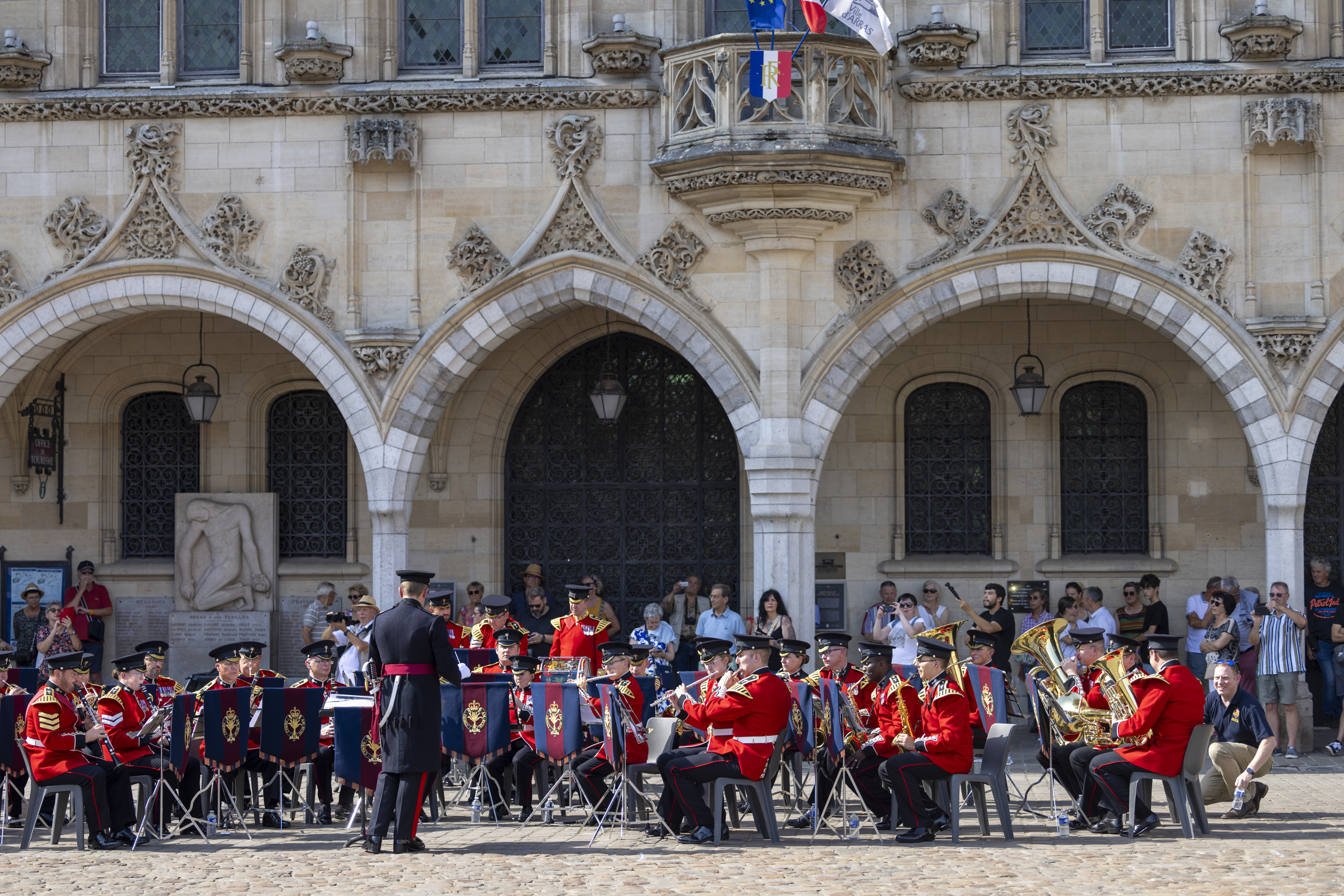 Having signed the Charter of Arras and enjoyed a reception in the Town Hall, everyone returned to the square where they and the people of Arras gathered to enjoy a performance by the Band of the Welsh Guards, resplendent in scarlet tunics, and lead by the Director of Music of the Band of the Welsh Guards, Captain Matthew Simons.