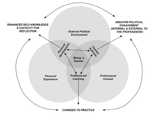 Mockler illustrates her views of teacher identity development through three domains: the external political environment, the professional context, and personal experience.