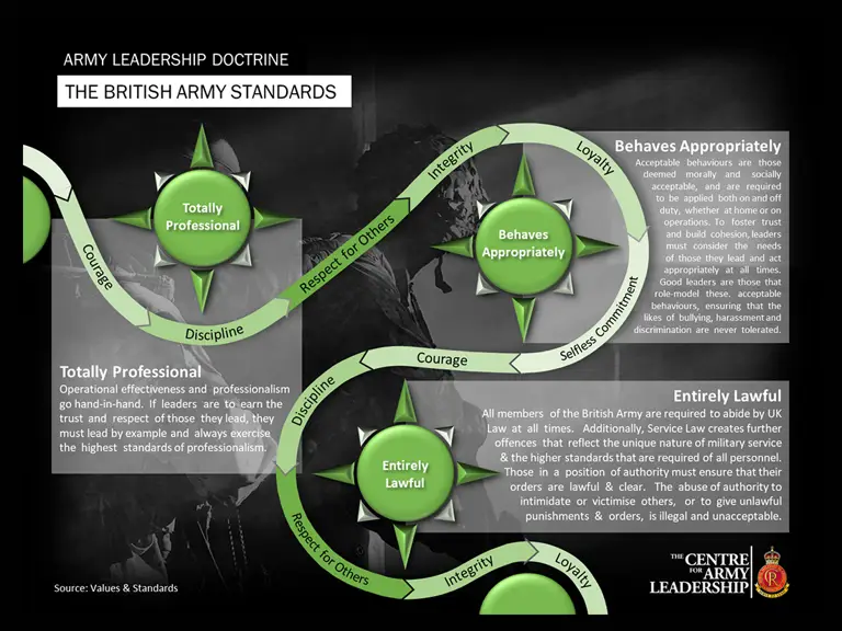 Being values-based is a principal characteristic of British Army Leadership, as well as fundamental to being an effective leader. These are more than simply words, but enduring organisational virtues that must drive and inform our everyday attitudes and behaviours.