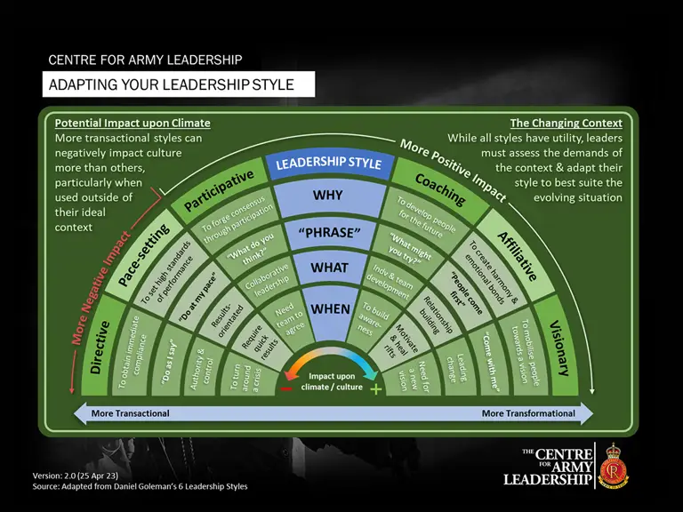 This diagram, adapted from Daniel Goleman’s 6 Leadership Styles, outlines the characteristics of the main leadership styles and the context for when and how each should be applied.