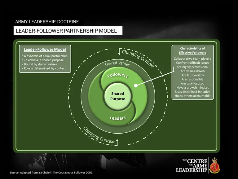 In the Army, the relationship between leader and followers extends beyond the typical superior-subordinate relationship indicative of military hierarchy and command. Sometimes circumstances will arise that require those in a superior position of authority to follow those who hold a more subordinate appointment. No one, therefore, is a ‘pure’ leader or a ‘pure’ follower - it is a dynamic relationship that is often dictated by the requirements of the situation.