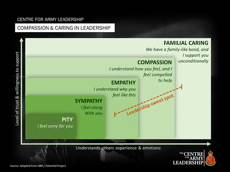 Empathy and compassion are vital skills for all leaders, and key to ‘knowing your people’ - a core element of the Army Leadership Framework. It requires a personal understanding of the emotions and feelings of others, combined with a genuine willingness to improve the situation.