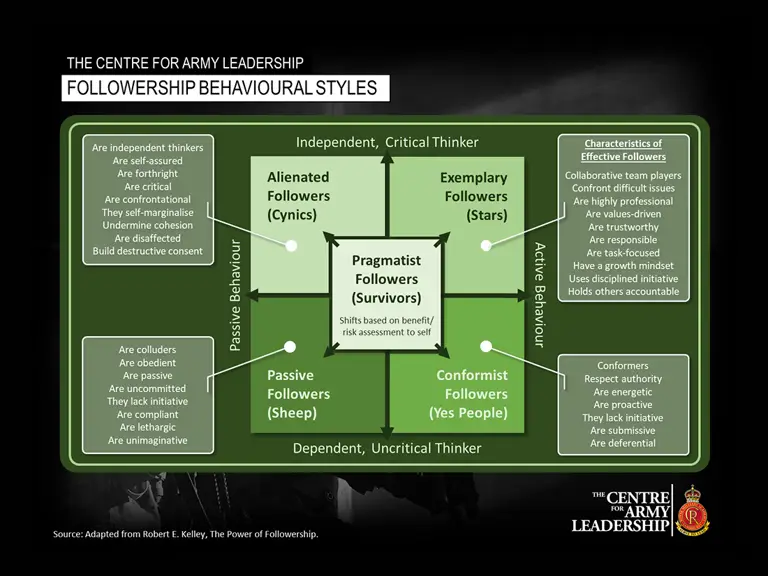 An individual’s character, motivations, and experience, coupled with the environment they are working in (leaders, peers, climate, culture and task), all influence behaviour. Follower effectiveness can therefore be assessed across two continuums: the level of a follower’s engagement, from passive to active; and their ability to exercise independent, critical thinking. The result is a presentation of five dominant followership behavioural styles:
